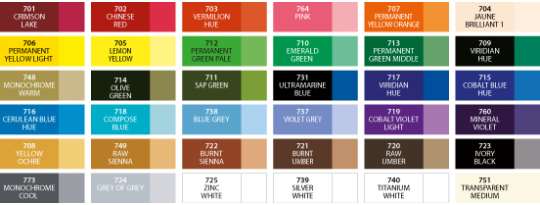 701 Crimson Lake, 702 Chinese Red, 703 Vermilion Hue, 764 Pink, 707 Permanent Yellow Orange, 704 Jaune Brilliant 1,