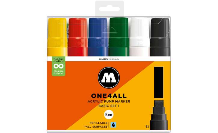 Ez a készlet 6 db ONE4ALL™ 627HS akril markert tartalmaz, vágott 15mm-es heggyel. Átlátszó, visszazárható tasakba csomagolva, termékinformációkkal.